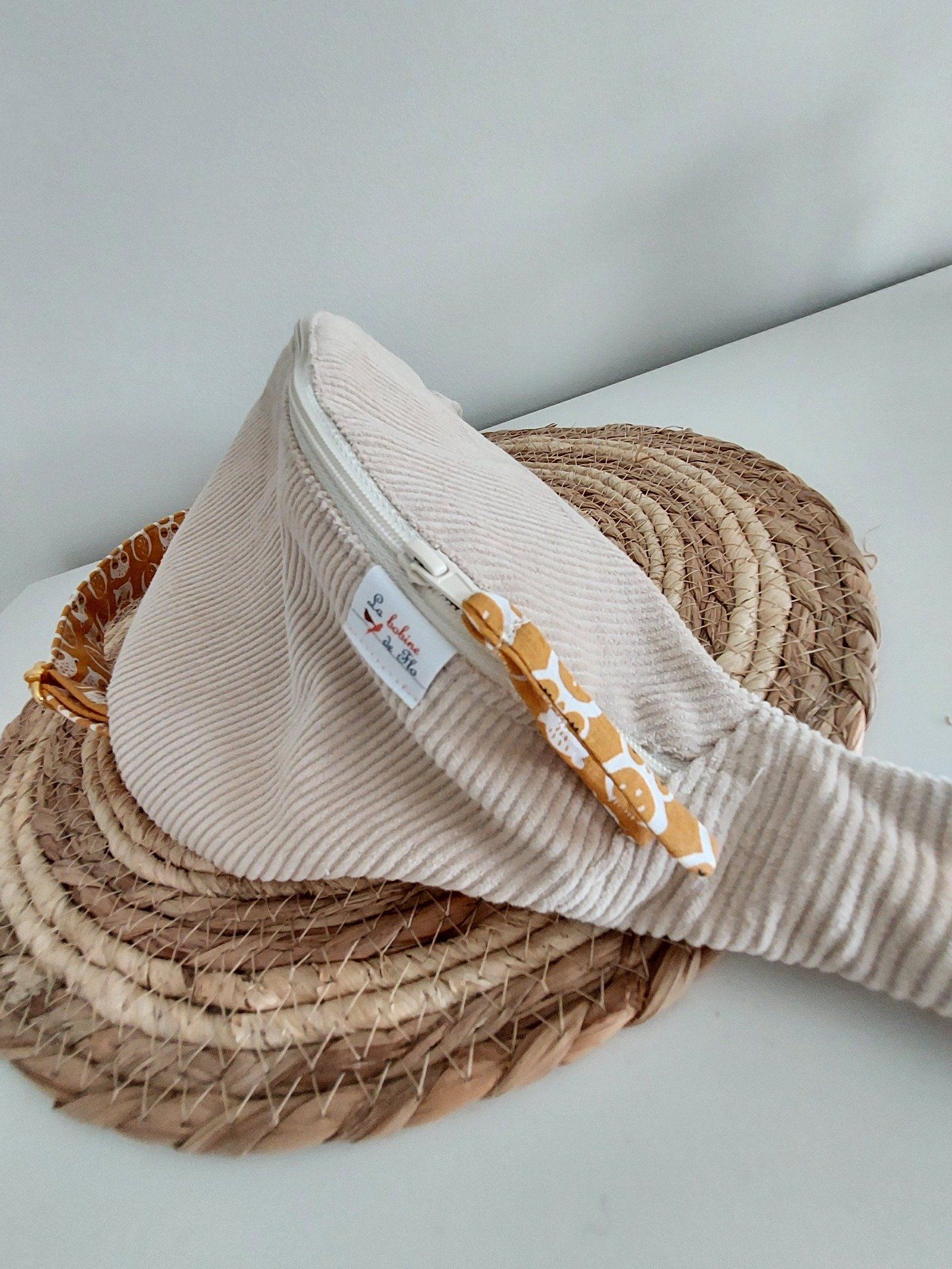 En tissu velours beige clair et doublure coton fantaisie motifs hiboux .Il a une forme souple et allongée. Sa fermeture zippée est en mailles plastiques. Poche zippée intérieure.