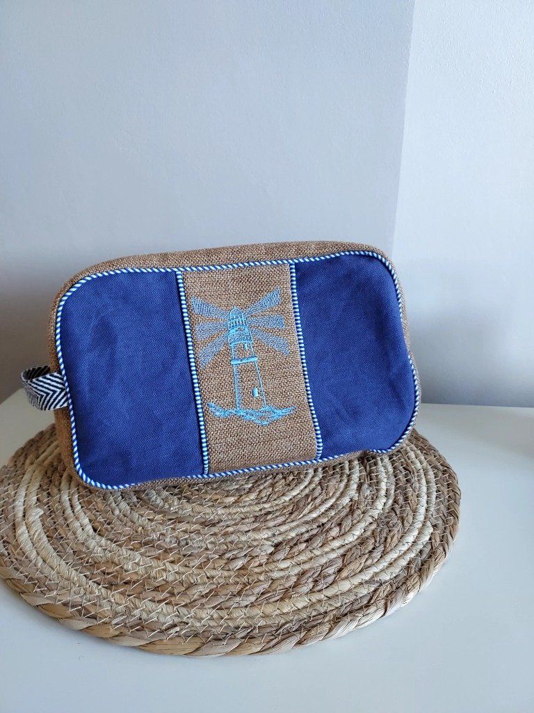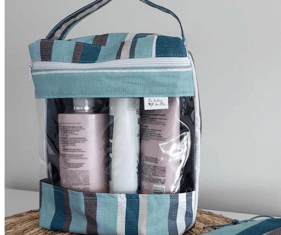 Trousse cristal et tissu enduit rayé bleu - produits de toilette- shampoing