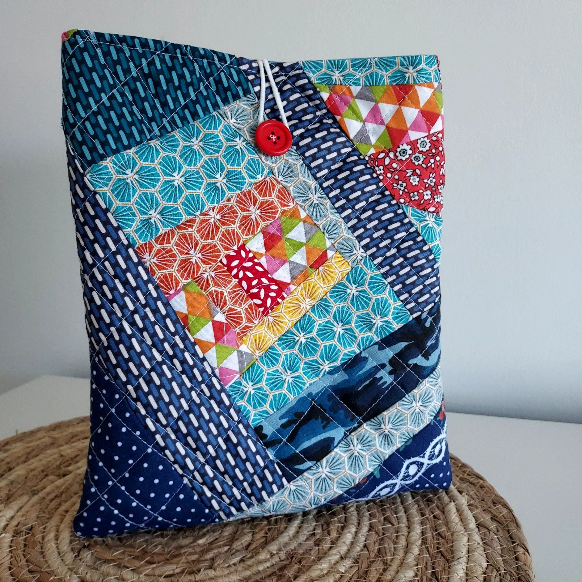 En coton, matelassée en Crazy avec des chutes de tissu, elle se ferme avec un bouton .