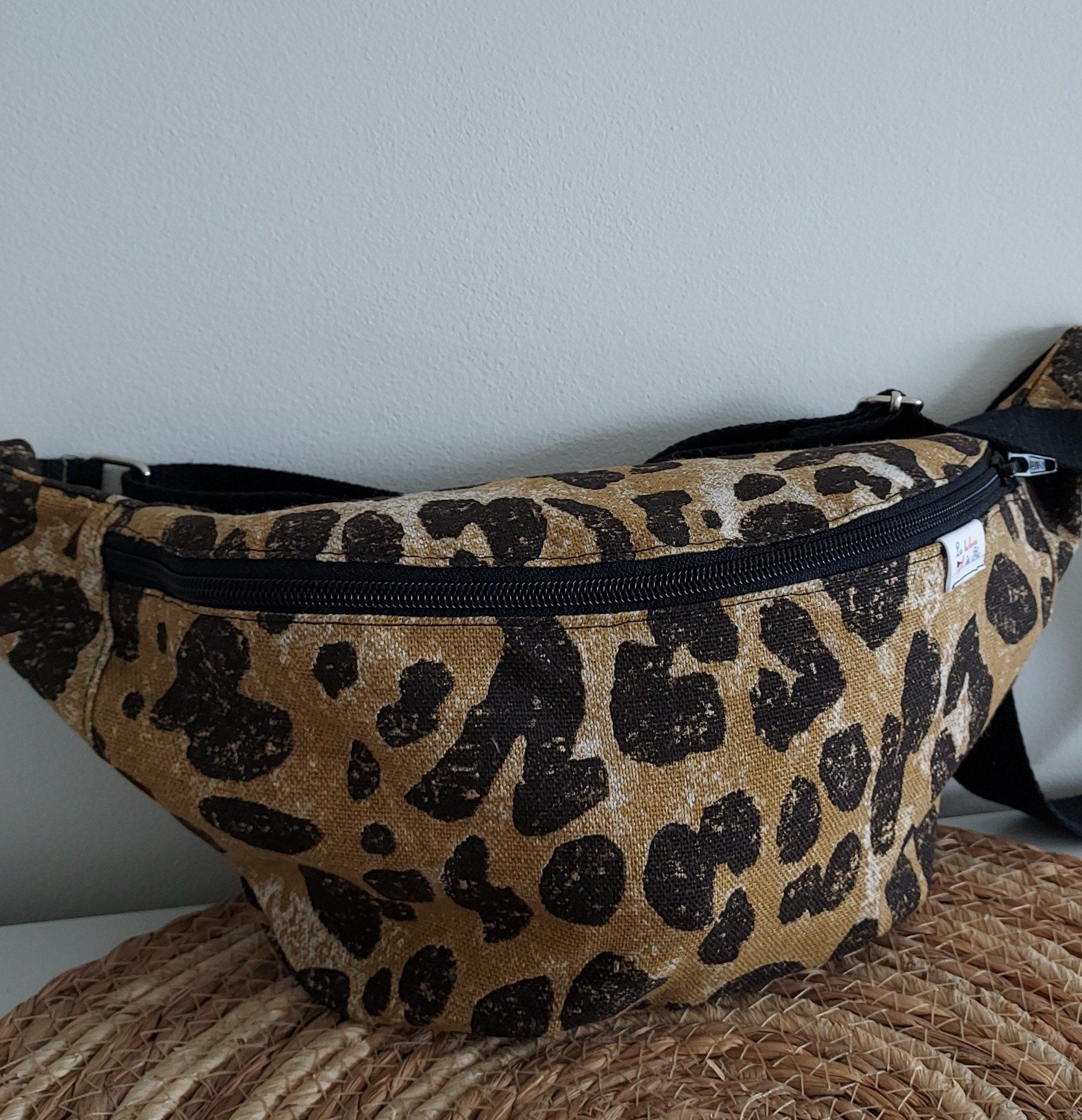 En tissu coton léopard moutarde et doublure coton moutarde.Il a une forme souple et allongée. Sa fermeture zippée est en mailles plastiques. Poche zippée intérieure.