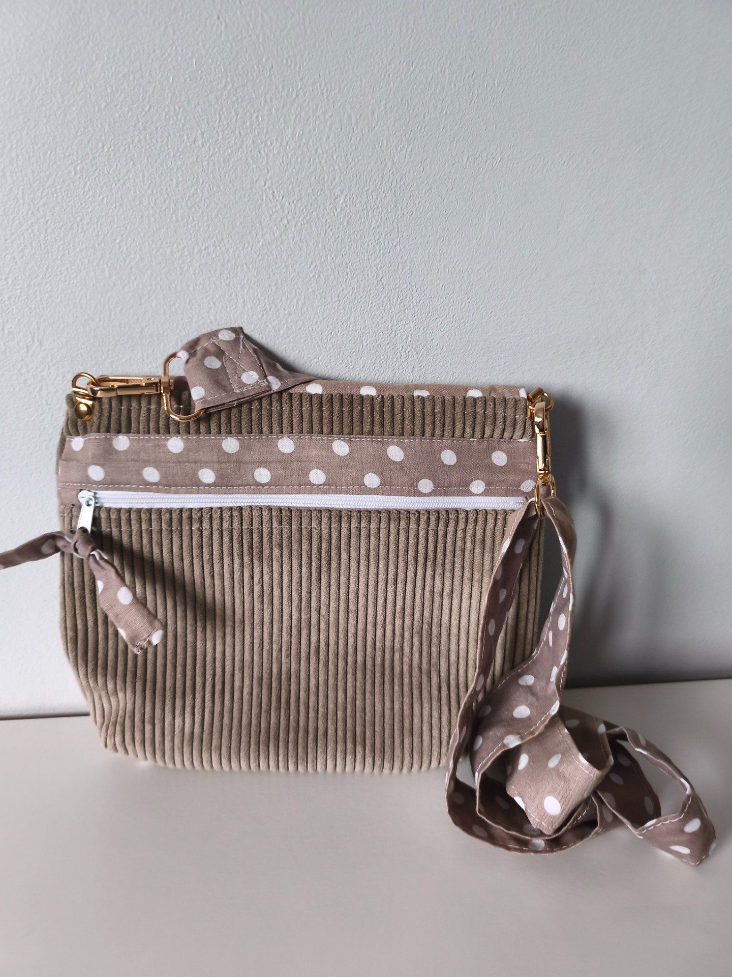 Sac bandoulière en coton fantaisie et velours et doublure coton uni, avec une poche zippée sur le dos et une poche plaquée sur le devant. Un rabat pour protéger, il se ferme grâce à un fermoir.